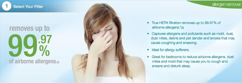 The Allergen Remover Filter from Aer1 is ideal for allergy sufferers. With True HEPA filtration is removes up to 99.7% of airborne allergens. It even captures allergens and pollutants such as; mold, dust, dust mites debris, pet dander, even smoke that may cause coughing or sneezing. It is great for bedrooms to reduce airbone allergence, dust mites and mold that may cause you to cough or sneeze and disturb your sleep.